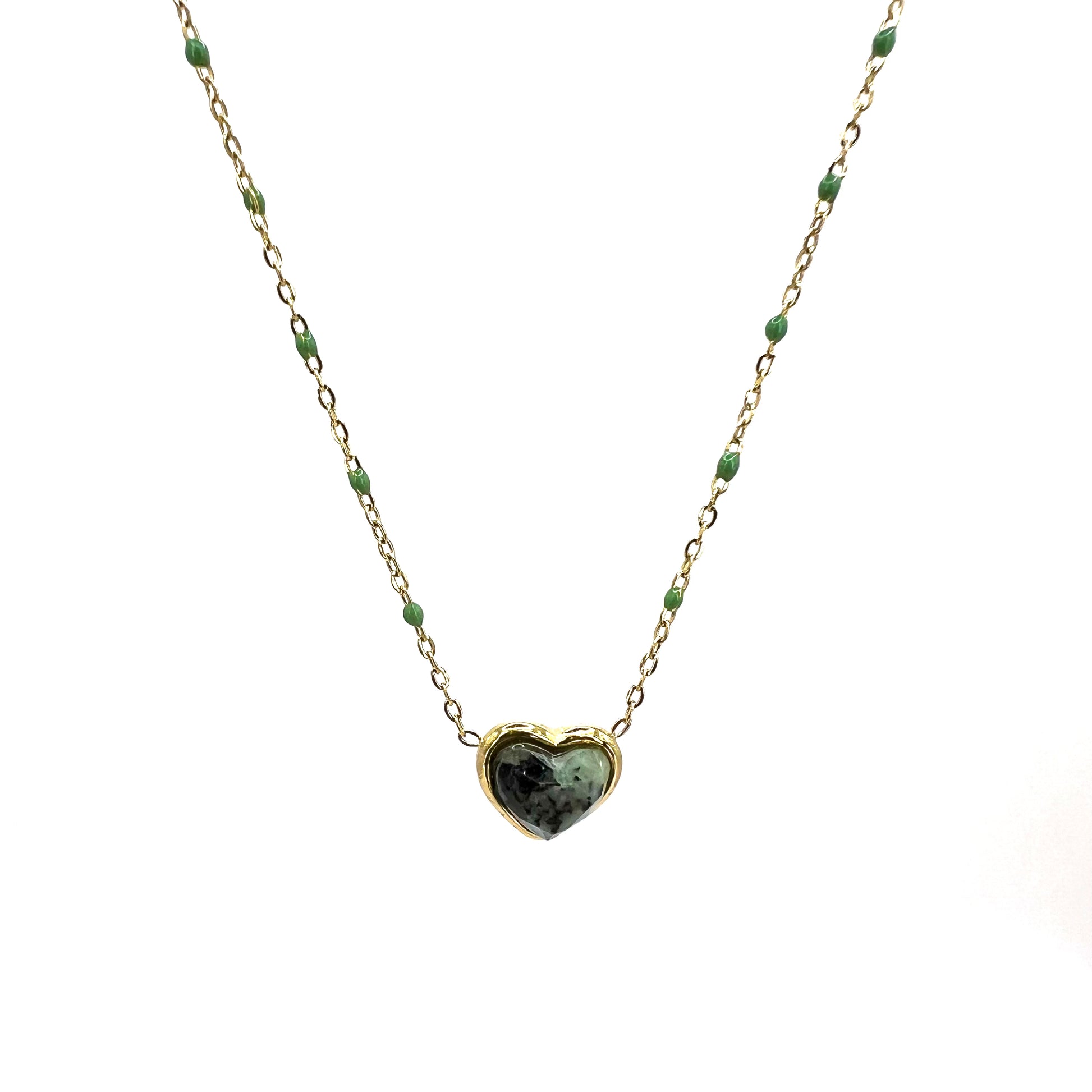 Collier en acier inoxydable doré avec pendentif coeur en pierre naturelle verte